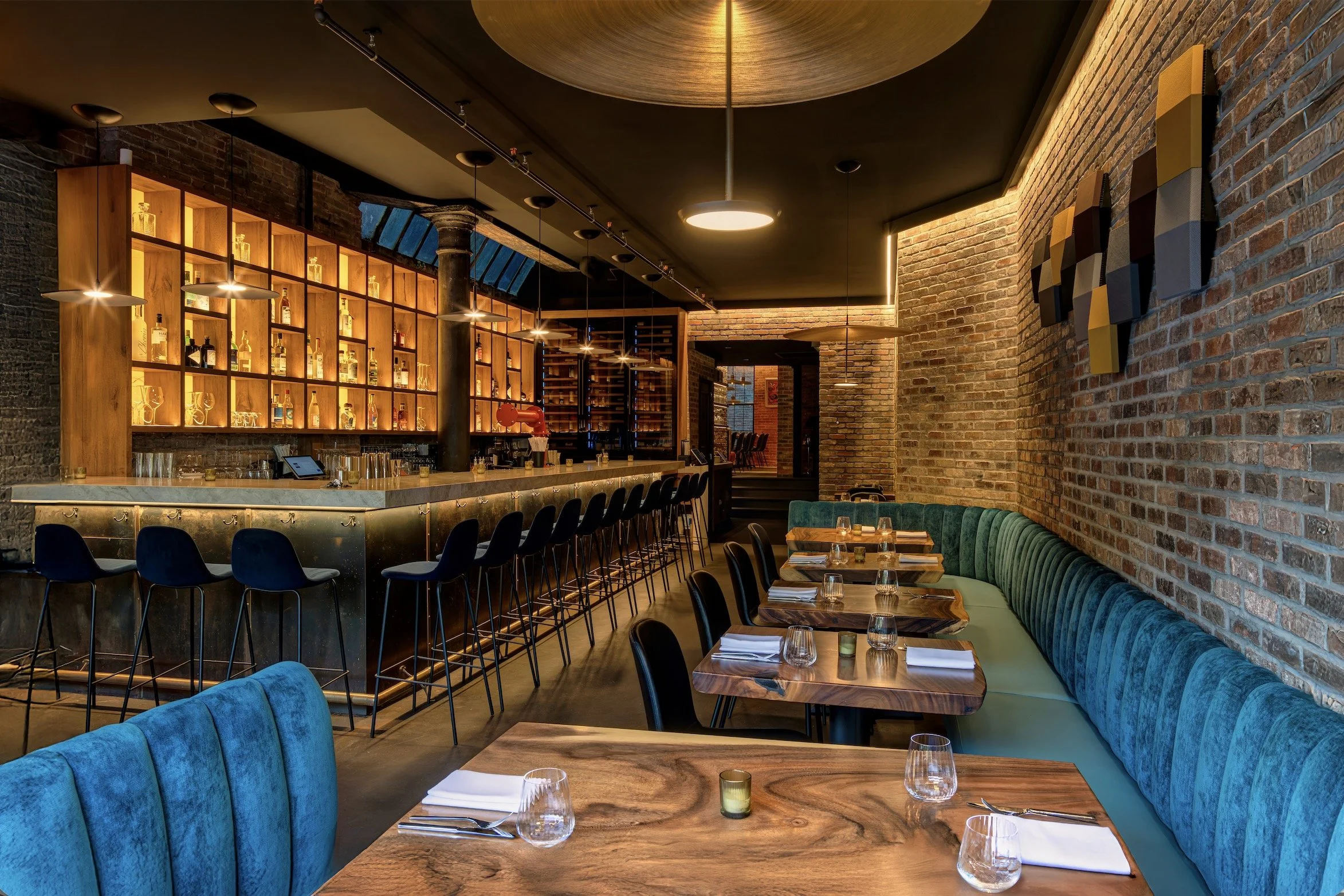 Banquettes in the bar room are upholstered in blue velvet and feel sumptuous. PHOTO: Anthony Giglio