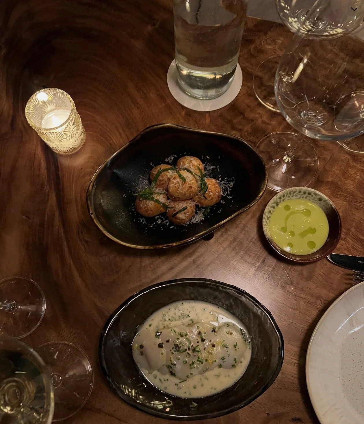 A yellowfin tuna crudo arrived clean and elegant, the fish dressed lightly with avocado oil and topped with shaved onion and herbs. The dish leaned toward restraint—letting pristine seafood carry the plate.