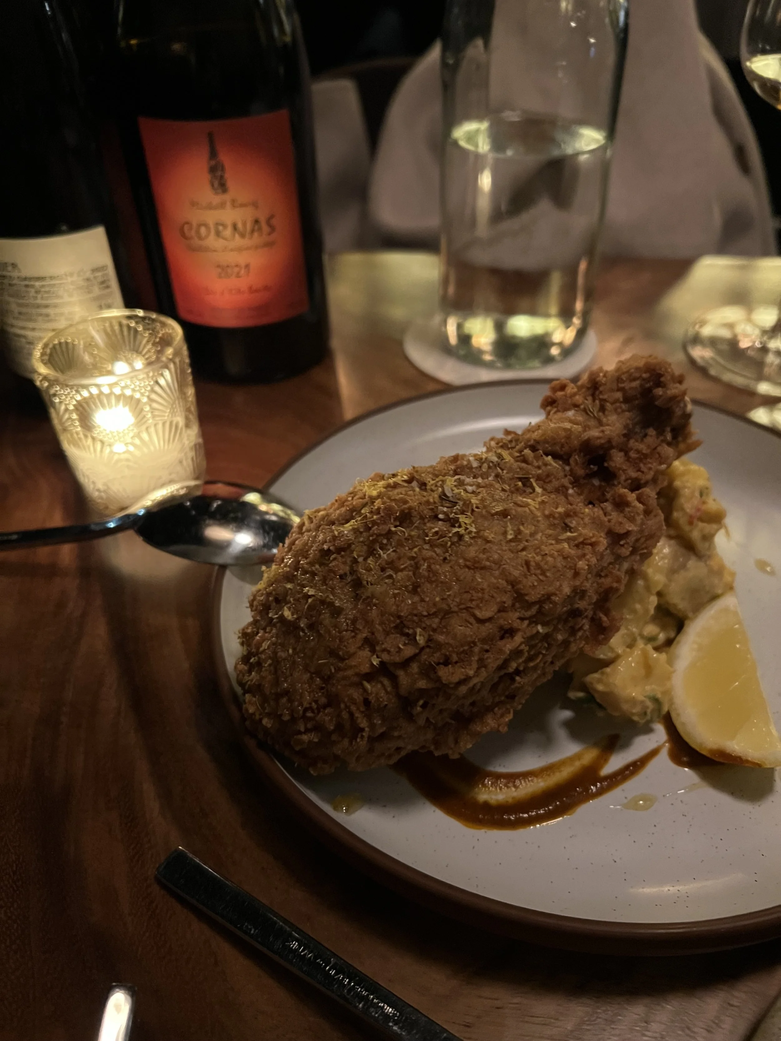 The whole wheat fried chicken, a massive drumstick with a deeply craggy crust, arrived perched over a tangy potato salad with a wedge of lemon. It was indulgent but not heavy—crispy, salty, and absolutely satisfying.