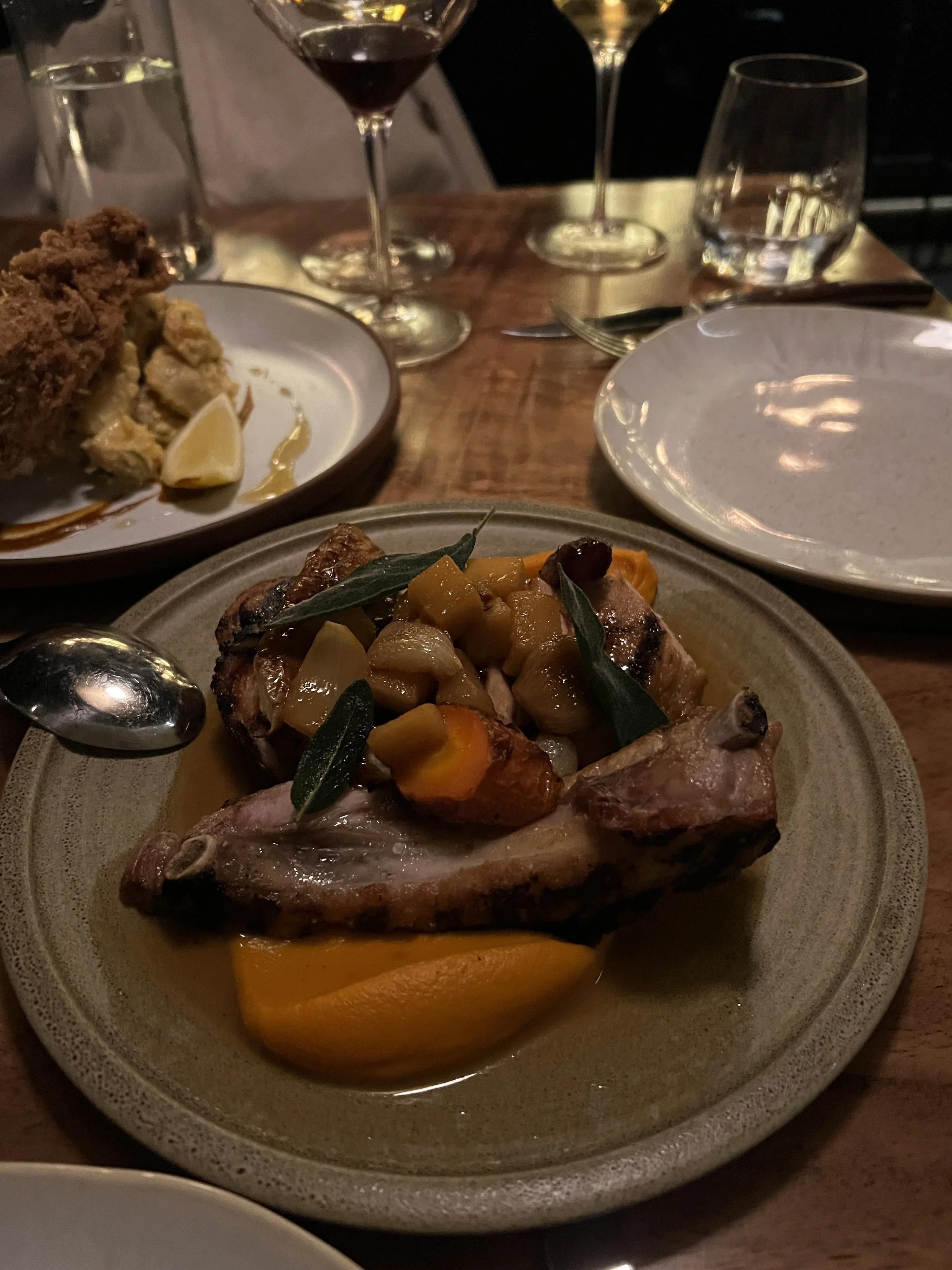 The Iberian pork chop offered a more composed presentation: thick slices layered over a velvety squash purée and topped with roasted fruit and sage. The sweetness of the fruit played beautifully against the pork’s richness.